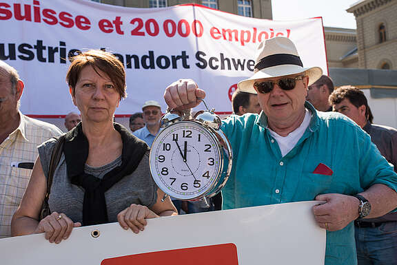 Der Wecker, den die Delegierten der Unia-Industriekonferenz an SNB-Vizepräsident Danthine übergaben, zeigt auf 5 vor 12. Denn der massiv überteuerte Franken – eine Folge der Aufhebung des Euro-Mindestkurses – droht den Industriestandort zu zerstören. Tausende Arbeitsplätze sind in Gefahr.