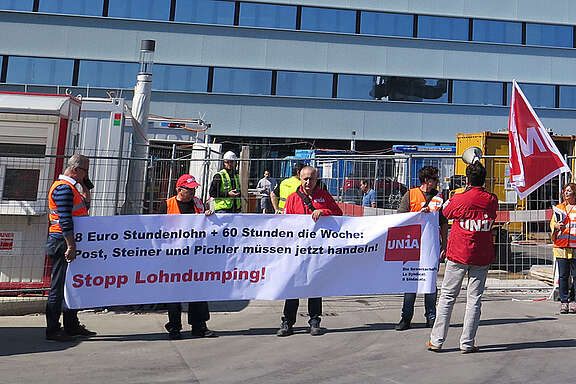 Der Lohndumpingfall auf der Berner Baustelle «PostParc» ist der Unia und dem Generalunternehmen Steiner AG seit Langem bekannt. Derweil hätten die Bauherrin PostFinance AG und die «Steiner AG» genügend Zeit gehabt, die Probleme zu bereinigen. Doch eine Lösung ist weiterhin nicht in Sicht. Deshalb organisierte die Unia eine Protestaktion, um auf die Missstände aufmerksam zu machen. Mit dieser Aktion fordert die Unia mit den betroffenen Arbeitern sofortige Massnahmen gegen Lohndumping auf der Baustelle.