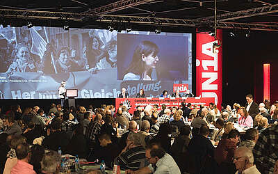 Die rund 350 Delegierten am Unia-Kongress haben Vania Alleva als Präsidentin und die nominierten bisherigen Mitglieder der Geschäftsleitung klar…