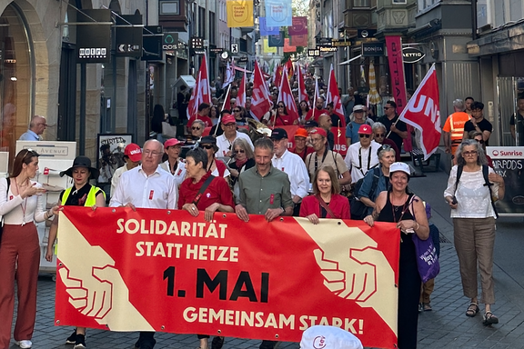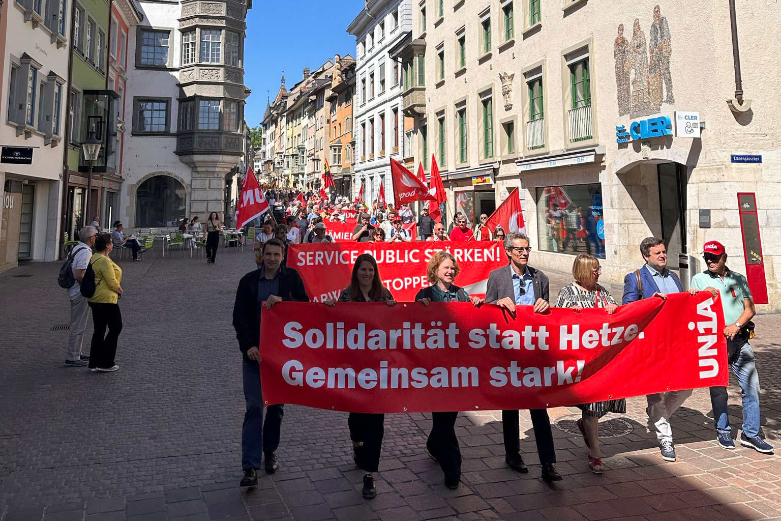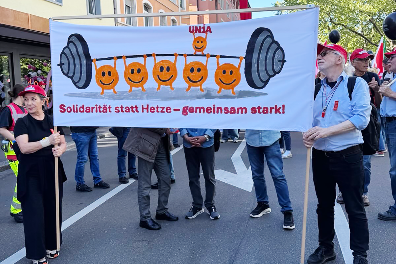 Am Tag der Arbeit waren wiederum Zehntausende in der ganzen Schweiz auf der Strasse. Unter dem Motto «Solidarität statt Hetze – gemeinsam stark!» setzten sie ein klares Zeichen gegen Nationalismus und Ausländerfeindlichkeit. Die Unia-Redner:innen sagten klar Nein zur gefährlichen und scheinheiligen SVP-Initiative «Keine 10-Millionen-Schweiz».