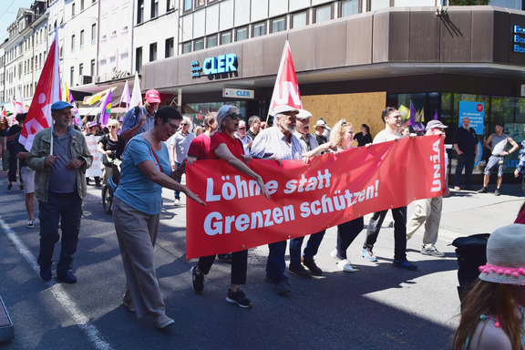 «Solidarität kennt keine Grenzen. Armut, Ausgrenzung, Ungerechtigkeit machen an Landesgrenzen nicht Halt – unser Widerstand auch nicht. Wir kämpfen gemeinsam gegen prekäre Jobs, gegen steigende Mieten, gegen Sozialabbau, gegen Angriffe auf Frauenrechte, Queers, Migrant:innen. Wir kämpfen dagegen, dass die Klimakrise auf dem Rücken der Ärmsten ausgetragen wird.»
