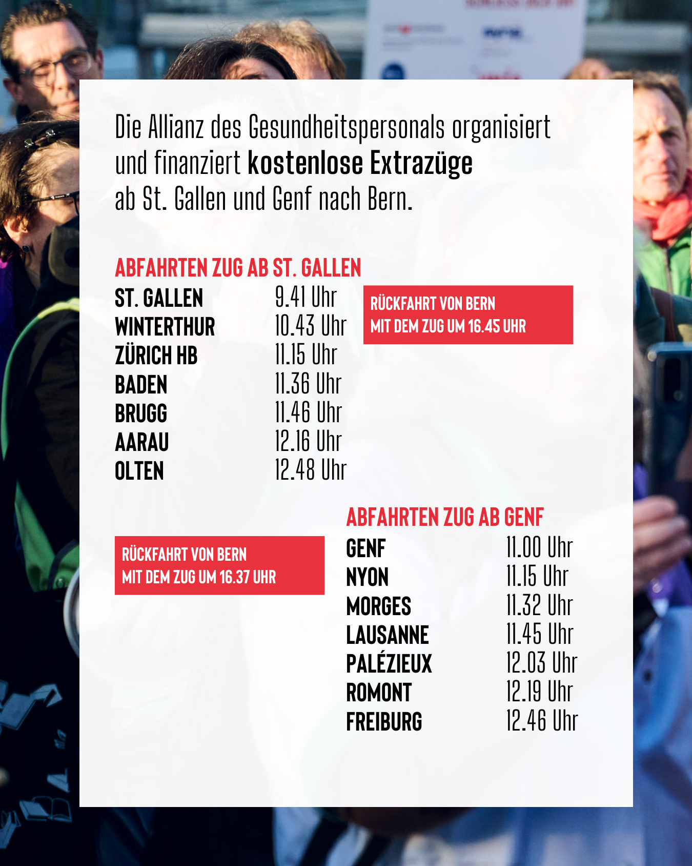 Demoteilnehmer:innen aus anderen Regionen können mit ihrem Unia-Sekretariat vor Ort Kontakt aufnehmen. Die Sekretariate informieren über allfällige gemeinsame Anreise und Gratis-Tickets für Unia-Mitglieder.