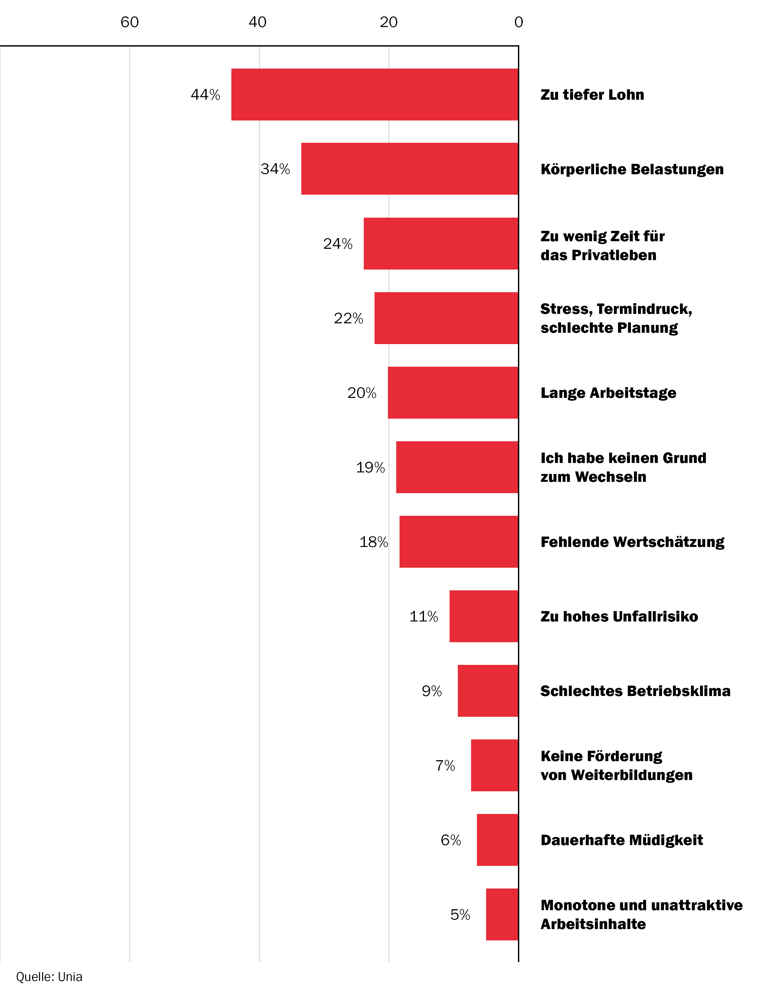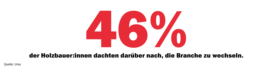Laut Umfrage sind die Holzbauer:innen mit der abwechslungsreichen Arbeit und den vielfältigen Weiterbildungsmöglichkeiten zufrieden. Die Unfallgefahr empfinden sie als tief oder als wenig problematisch. 19 Prozent der Befragten sehen daher keinen Grund für einen Branchenwechsel. Fast die Hälfte überlegt sich jedoch einen Branchenwechsel – diese Faktoren tragen dazu bei: