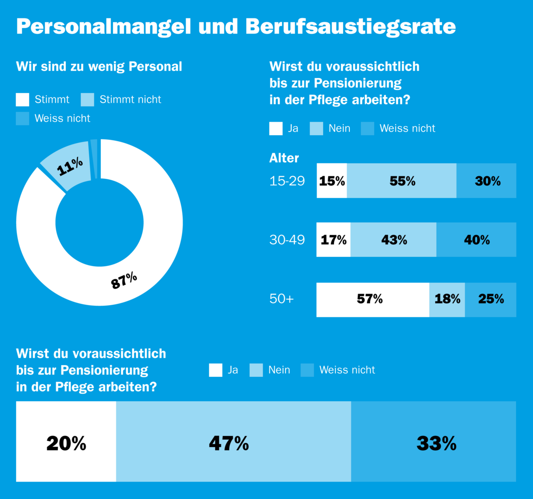 33 Prozent gaben als Grund die «hohe Belastung durch unzureichende Arbeitsbedingungen» an, 49 Prozent begründeten ihren Ausstiegswunsch primär mit gesundheitlichen Problemen durch den Pflegeberuf.