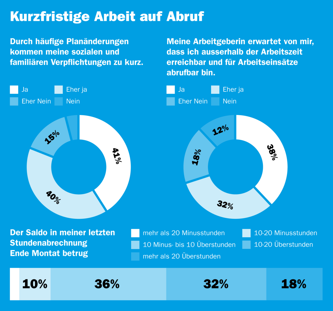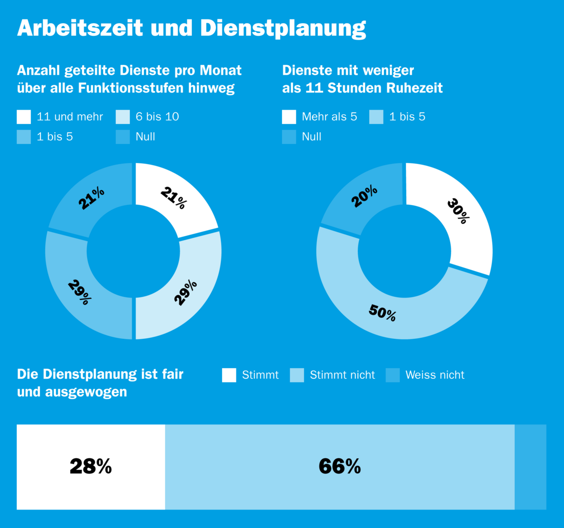 67 Prozent der Pflegenden haben neben der Arbeit zu wenig Zeit für ihre Freizeit und Familie. Die Mehrheit empfindet die Dienstpläne als unausgewogen und leistet viele geteilte Dienste pro Monat. Letzteres insbesondere das Assistenzpersonal. Nur bei 20 Prozent wird die gesetzliche Ruhezeit eingehalten.