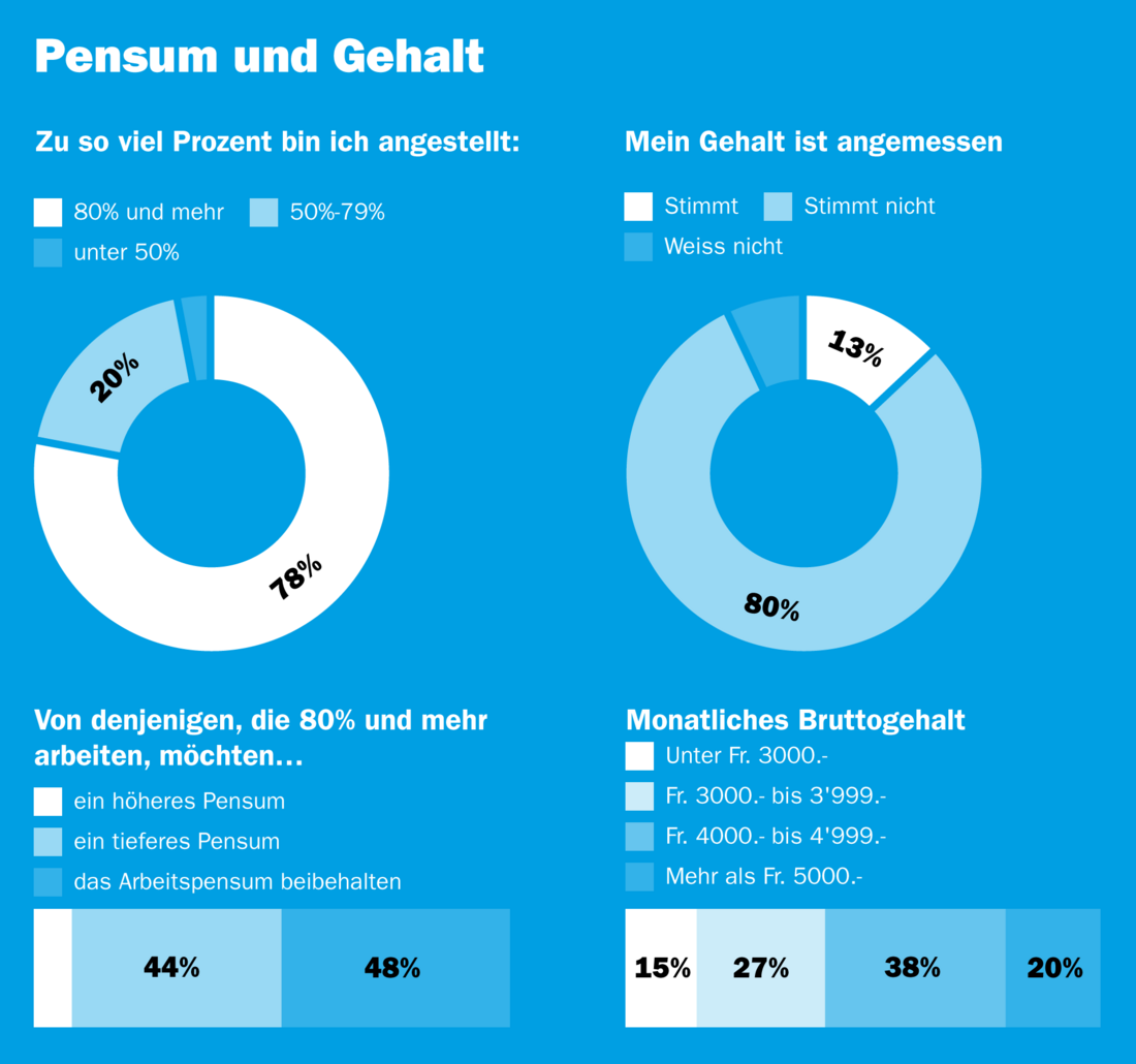 Die Frage nach dem Pensum scheint in erster Linie durch zwei Faktoren bestimmt: Einerseits hegen viele Pflegenden aufgrund der hohen Arbeitsbelastung sowie den unregelmässigen Arbeitszeiten den Wunsch ihr Pensum zu reduzieren. Andererseits aber ist dieser Wunsch aus finanzieller Perspektive nur schwer umzusetzen. Insbesondere für Fachangestellte Gesundheit und das Assistenzpersonal ist eine Pensen-Reduktion ohne eine einschneidende Reduktion des Lebensstandards nicht möglich. Problematisch ist hierbei, dass Betriebe nicht selten versuchen, überlastete oder gesundheitlich angeschlagene Pflegende zu tieferen Pensen zu zwingen – einerseits aus Gründen des Gesundheitsschutzes, andererseits aber auch weil ein grosser Anteil Pflegender mit tiefen Pensen eine flexiblere Planung ermöglicht. Dies führt aber bei einem Grossteil des Personals tatsächlich zu finanziellen Notlagen und einem Leben in Armut.