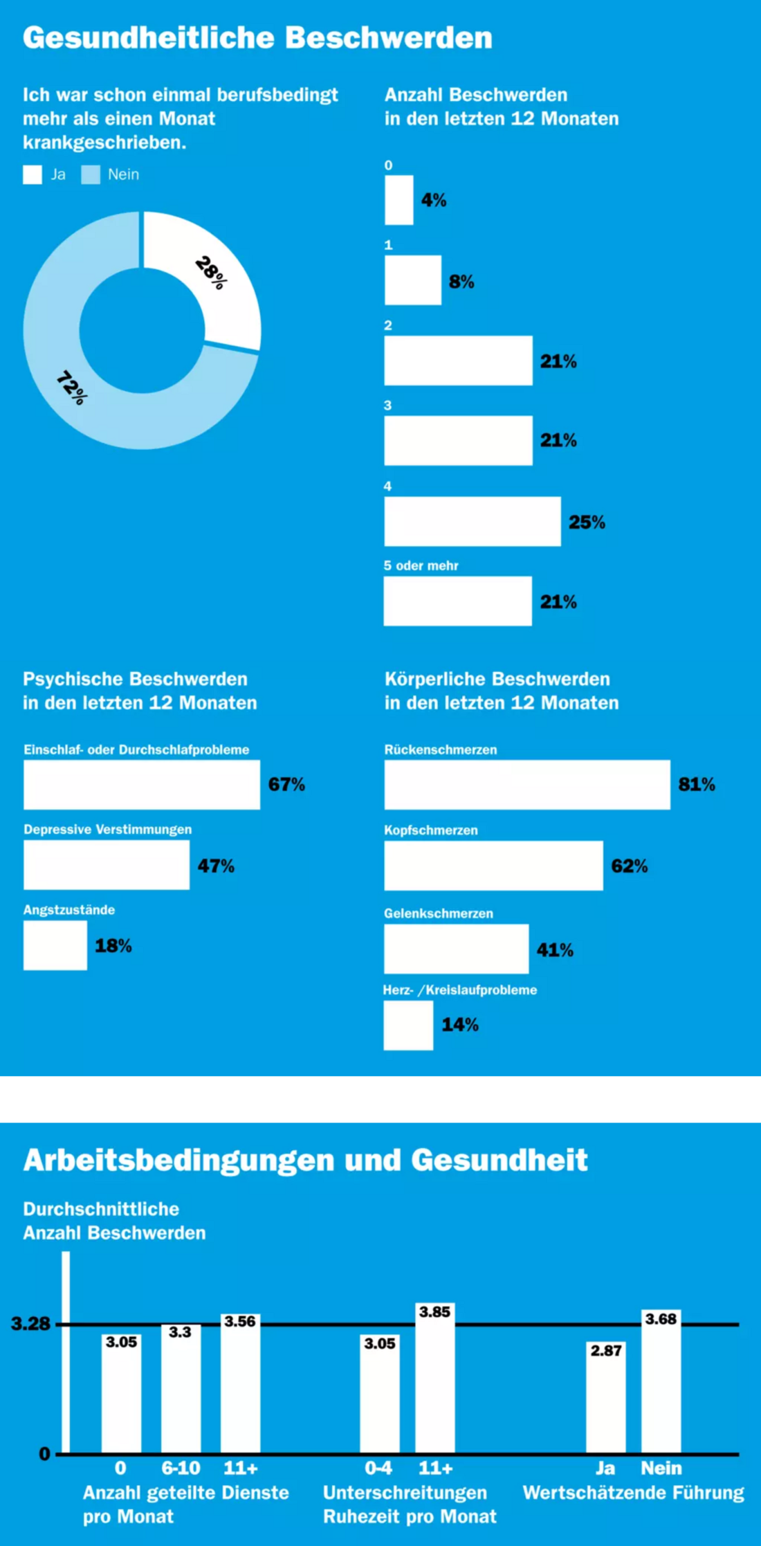 Die Gründe für den Berufsausstieg stehen zum einen ganz klar in direkter Verbindung mit dem konstanten Druck und den oben beschriebenen schlechten Arbeitsbedingungen, die direkt zu einem Push-Effekt führen. Zum anderen sind es auch die gesundheitlichen Probleme der Beschäftigten, die sie zu einem Berufsausstieg zwingen. Auch diese stehen im Zusammenhang mit der konstanten physischen und psychischen Überbelastung des Personals.