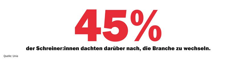Sehr viele Schreiner:innen spielen mit dem Gedanken, die Branche zu verlassen. Insgesamt haben sich 45 Prozent schon einmal ernsthaft mit einem Branchenwechsel beschäftigt. Durchschnittlich will fast jede:r zweite Schreiner:in den Beruf verlassen. Dabei gibt es regionale Unterschiede. Im Tessin ist die Neigung etwas geringer: 38 Prozent können sich ihre Zukunft ausserhalb des Schreinergewerbes vorstellen.