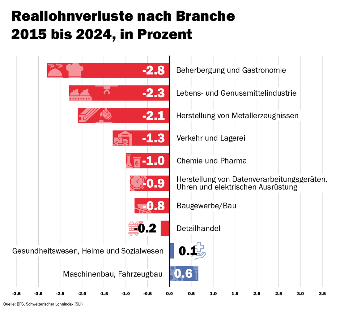 Nach der Corona-Krise sind die Konsumentenpreise stark gestiegen, während die Löhne nicht genug erhöht wurden. Die Reallöhne sind zwischen 2020 bis 2024 in allen Branchen gesunken. Zwar stiegen die Löhne 2024 endlich wieder leicht, doch das reicht nicht, um die Verluste der Vorjahre auszugleichen. Heute liegen die Reallöhne etwa auf dem Stand von 2015, in vielen Branchen sogar darunter.