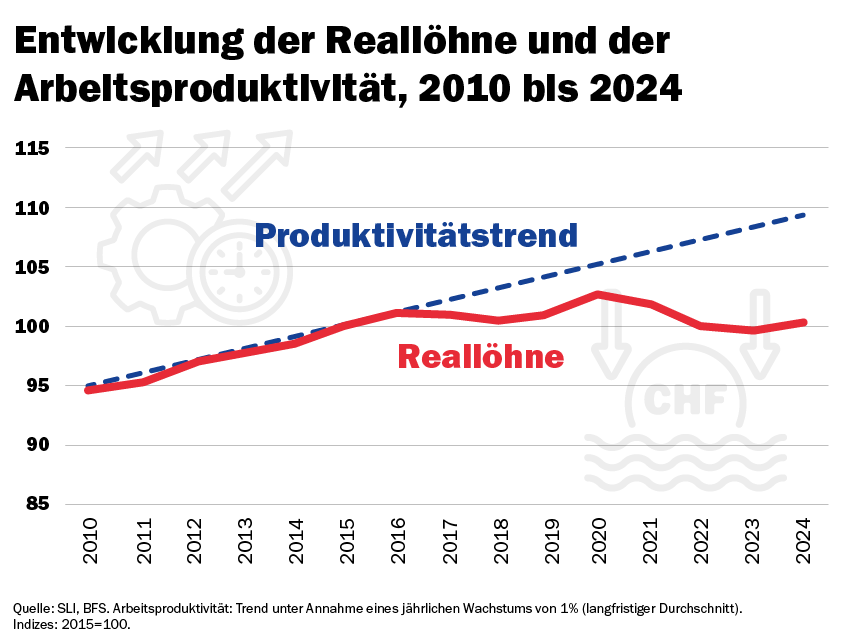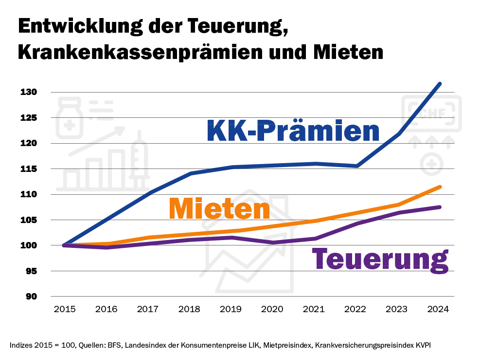 Nicht nur höhere Konsumentenpreise (Teuerung) haben den Löhnen zugesetzt – auch steigende Mieten und Krankenkassenprämien belasten die Haushalte zunehmend. Die Mieten sind heute über 10 Prozent höher als 2015. Die Krankenkassenprämien sind sogar um mehr als 30 Prozent gestiegen – und haben sich in den letzten 25 Jahren mehr als verdoppelt. Diese Kostenexplosion frisst Lohnerhöhungen regelrecht auf. Damit die Kaufkraft erhalten bleibt, müssten die Löhne im gleichen Ausmass steigen wie die Lebenskosten. Doch das ist nicht der Fall – und das trifft viele Arbeitende hart.
