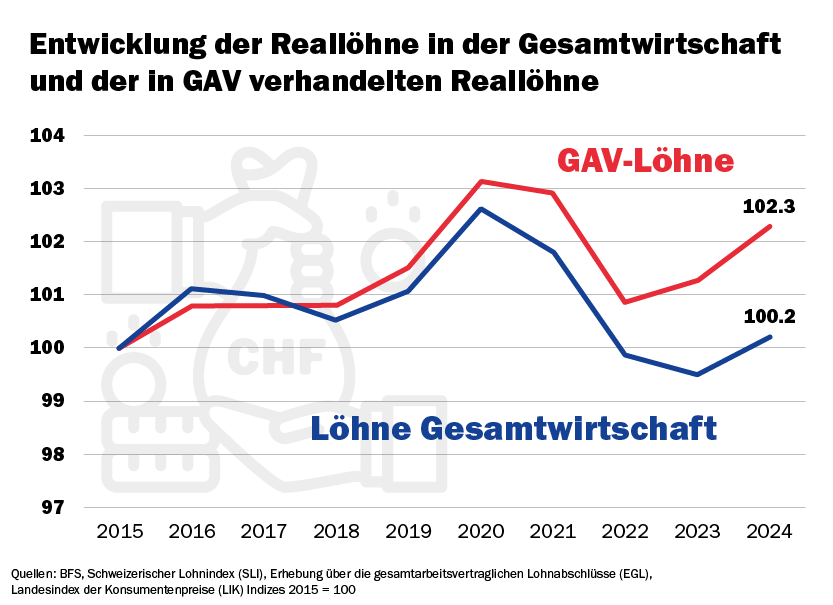 In Branchen mit Gesamtarbeitsverträgen (GAV) haben sich die Löhne deutlich besser entwickelt als in der Gesamtwirtschaft. Die realen GAV-Löhne liegen fast wieder auf dem Niveau von vor der Corona-Krise, der Reallohnverlust der letzten Jahre ist grösstenteils aufgeholt. Das zeigt: Mit starken Gewerkschaften und kollektiven Verhandlungen lassen sich Löhne sichern – auch in schwierigen Zeiten.