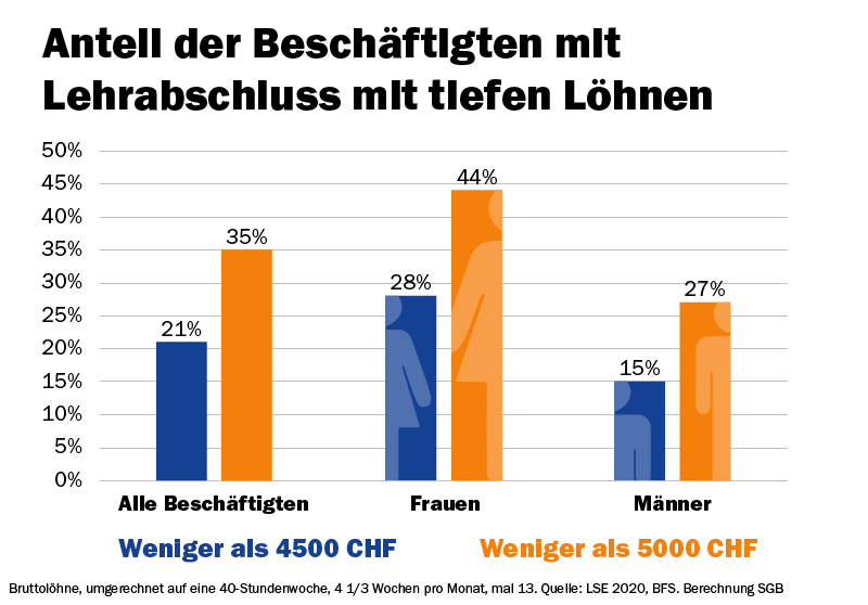 Eine Studie des SGB zeigt, dass viele Beschäftigte tiefe Löhne verdienen, sogar mit Lehrabschluss. Jede:r Fünfte verdient brutto weniger als 4500 Franken pro Monat und sogar jede:r Dritte weniger als 5000 Franken. Bei den Frauen sind es noch viel mehr. Fast die Hälfte der Frauen mit Lehrabschluss hat einen Monatslohn unter 5000 Franken.