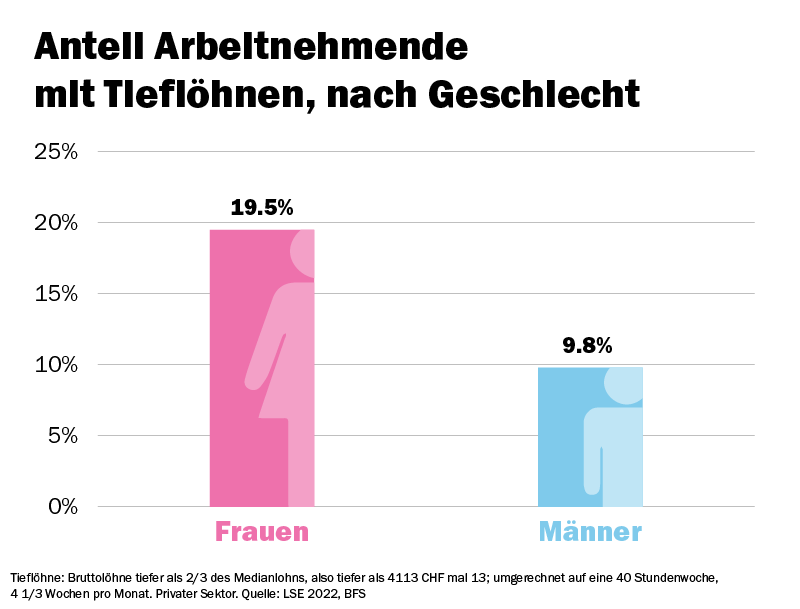 In Branchen mit hohem Frauenanteil – etwa im Detailhandel, in der Pflege, der Reinigung oder im Gastgewerbe – sind die Löhne generell tiefer als in klassischen Männerberufen. Hinzu kommt die anhaltende Lohndiskriminierung: Noch immer verdienen Frauen fĂĽr die gleiche Arbeit im Schnitt weniger als Männer. Laut den neusten Zahlen des Bundes liegt die durchschnittliche Lohndifferenz in der Privatwirtschaft bei 17,5  Prozent. Davon lassen sich 45 Prozent nicht durch Faktoren wie Beruf, Branche oder Alter erklären – sondern einzig durch das Geschlecht.