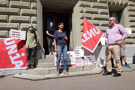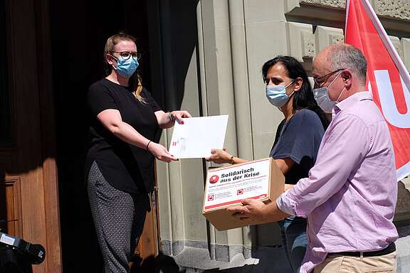 Fast eine Millionen Menschen stehen in Kurzarbeit und erhalten nur 80% ihres üblichen Lohnes. Doch eine Lohneinbusse von 20% ist für viele Arbeitnehmende nur schwer zu verkraften; mit 20% weniger Lohn haben viele Mühe, sich und ihre Familien durchzubringen. Und: 60 Milliarden Franken Staatshilfe garantiert der Bund den Firmen in der Corona-Krise. Trotzdem steigen die Arbeitslosenzahlen. Das geht so nicht! Deshalb hat die Unia gemeinsam mit den Verbänden des SGB einen Appell lanciert, der heute mit 20'153 Unterschriften dem Bundesrat übergeben wurde.