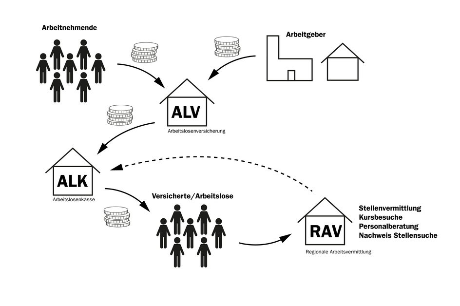 Die Arbeitslosenversicherung (ALV) gewährt einen Ersatz bei Erwerbsausfall. Die Arbeitslosenkassen (ALK) zahlen diesen aus. Die Regionalen Arbeitsvermittlungszentren (RAV) unterstützen bei der Stellensuche und kontrollieren, ob Sie die Vorschriften einhalten.
