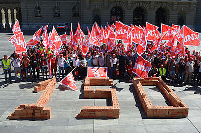 Près de 400 maçons du syndicat Unia se sont retrouvés à Berne pour leur…