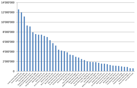 L’étude sur les écarts salariaux d’Unia passe sous la loupe 41 grandes entreprises, pour la plupart cotées en bourse. Ces entreprises ont versé en 2014 tout près d’un milliard de francs aux membres de leur direction et du conseil d’administration, soit 37 millions de plus que l’année précédente.