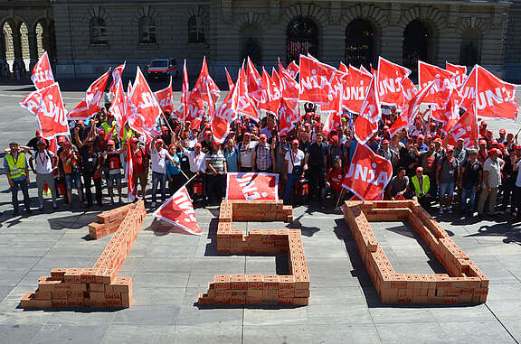 A l’issue de leur assemblée, les maçons se sont rendus en cortège jusqu’à la Place fédérale où ils ont représenté symboliquement leur revendication salariale. A l’aide de briques signées par des travailleurs de toute la Suisse, ils ont formé un chiffre de 150 francs géant. Il s’agit d’un message très clair adressé aux entrepreneurs: les salaires doivent augmenter!