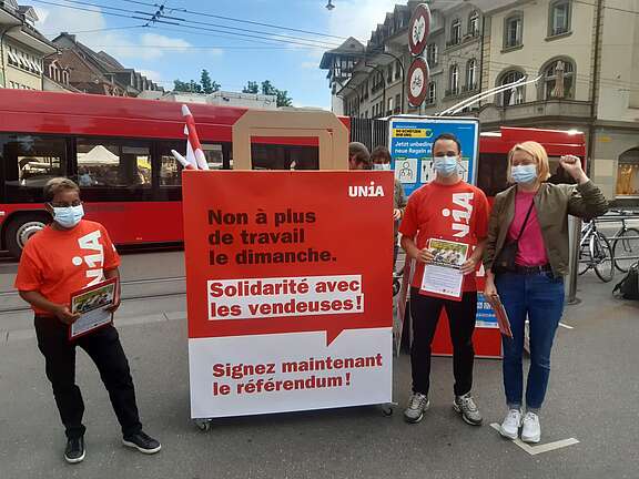 Le personnel de vente a lutté avec Unia pendant plusieurs mois contre l’extension des horaires d'ouverture des magasins. Cet engagement a porté ses fruits! En refusant l’ouverture des magasins quatre dimanches par an, les électrices et électeurs du canton de Berne s’opposent au fantasme bourgeois de libéraliser encore davantage le travail du dimanche.
