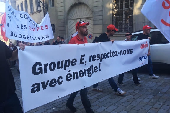 Dans plusieurs villes de Suisse romande, les travailleuses et travailleurs de Groupe E ont défilé derrière une banderole unitaire contre la menace de 188 licenciements.