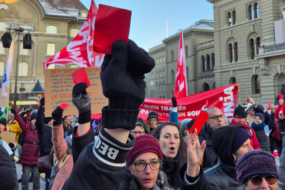 Les manifestant-e-s ont brandi un carton rouge aux autorités fédérales et cantonales, ainsi qu’aux assureurs. Alors que les autorités privent le secteur de la santé des moyens financiers nécessaires, les assureurs réalisent du profit au détriment du personnel et de la population. Les conditions de travail du personnel se dégradent, sans perspective d’amélioration si le modèle actuel est conservé.