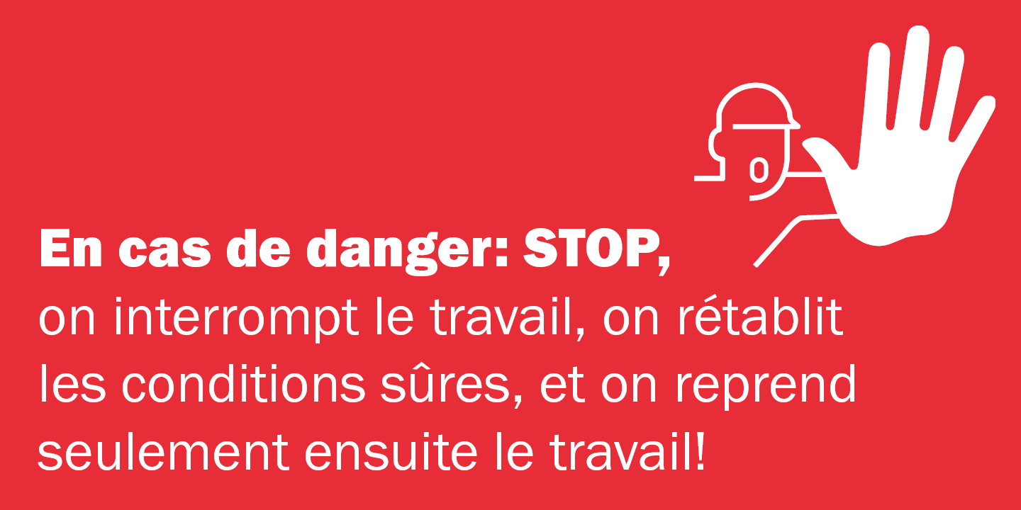 La SUVA, les organisations patronales et de travailleuses et travailleurs, les concepteurs/trices et les syndicats ont élaboré la charte de sécurité en commun. Les entreprises signataires s’engagent à appliquer la tolérance zéro en matière de sécurité au travail et à garantir le droit de «dire stop».