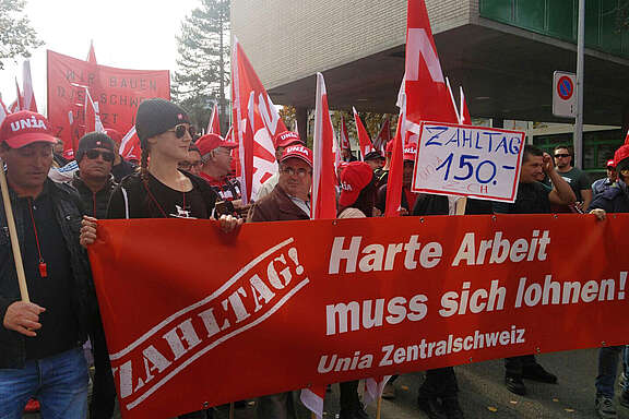 Nico Lutz, responsable du secteur Construction d’Unia, s’est exprimé à Lausanne devant plus de 3000 maçons: «Il est scandaleux que les maçons, qui travaillent dehors par tous les temps, qui ont un métier pénible et dangereux, aient toujours moins d’argent à la fin du mois à cause de la hausse du coût de la vie.» Et Pietro Carobbio déclare : «Le secteur de la construction se porte bien. Les ouvriers, au prix d’une augmentation des cadences et du stress, rapportent toujours plus aux entreprises. Pourtant, cela fait trois ans qu’il n’y a aucune augmentation salariale dans la branche. Cela doit changer, c’est une question de décence ! Des ouvriers qui travaillent dur, ça se paye correctement!»