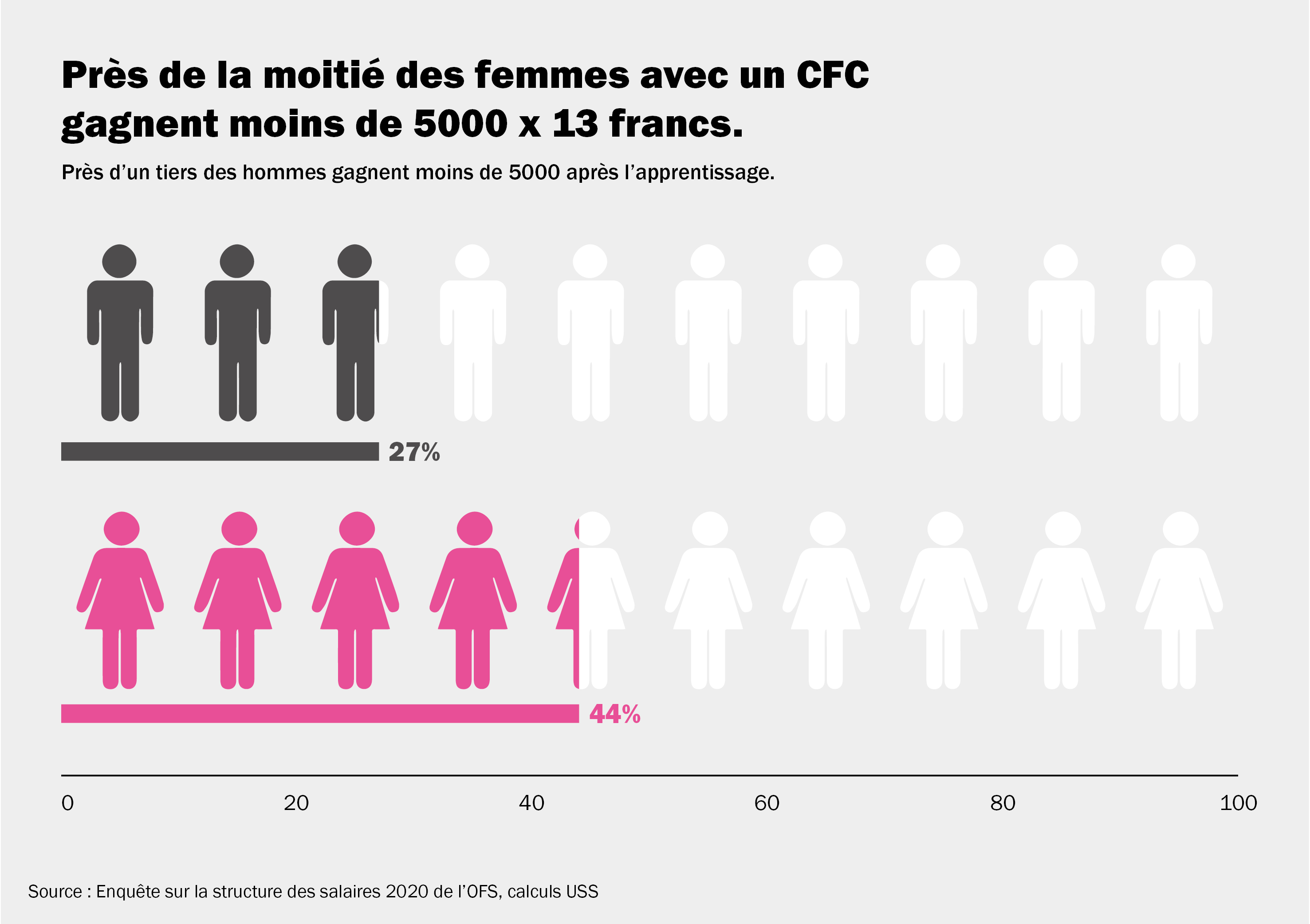 93 % des femmes ont achevé une formation, elles ont donc fait un apprentissage ou une formation supérieure. Pourtant, près d’une femme sur deux ayant terminé son apprentissage gagne moins de 5000 francs bruts par mois. Et cela pour un emploi équivalent plein temps.