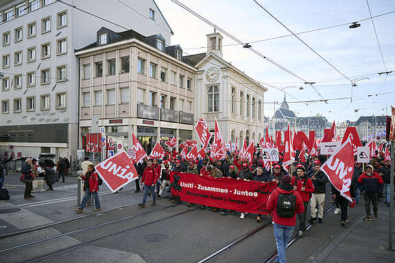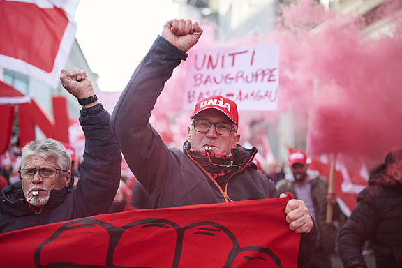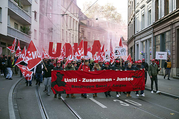 Près de 1000 travailleurs de la construction, venus d’Argovie, de Bâle-Campagne et de Bâle-Ville, se sont rassemblés aujourd’hui à Bâle, après avoir interrompu leur travail, puis ont bruyamment défilé à travers le centre-ville. Lors de la manifestation de clôture sur la Theodorskirchplatz, ils ont crié leur colère et leur détermination à poursuivre le combat si la SSE s’obstine à refuser les améliorations nécessaires.