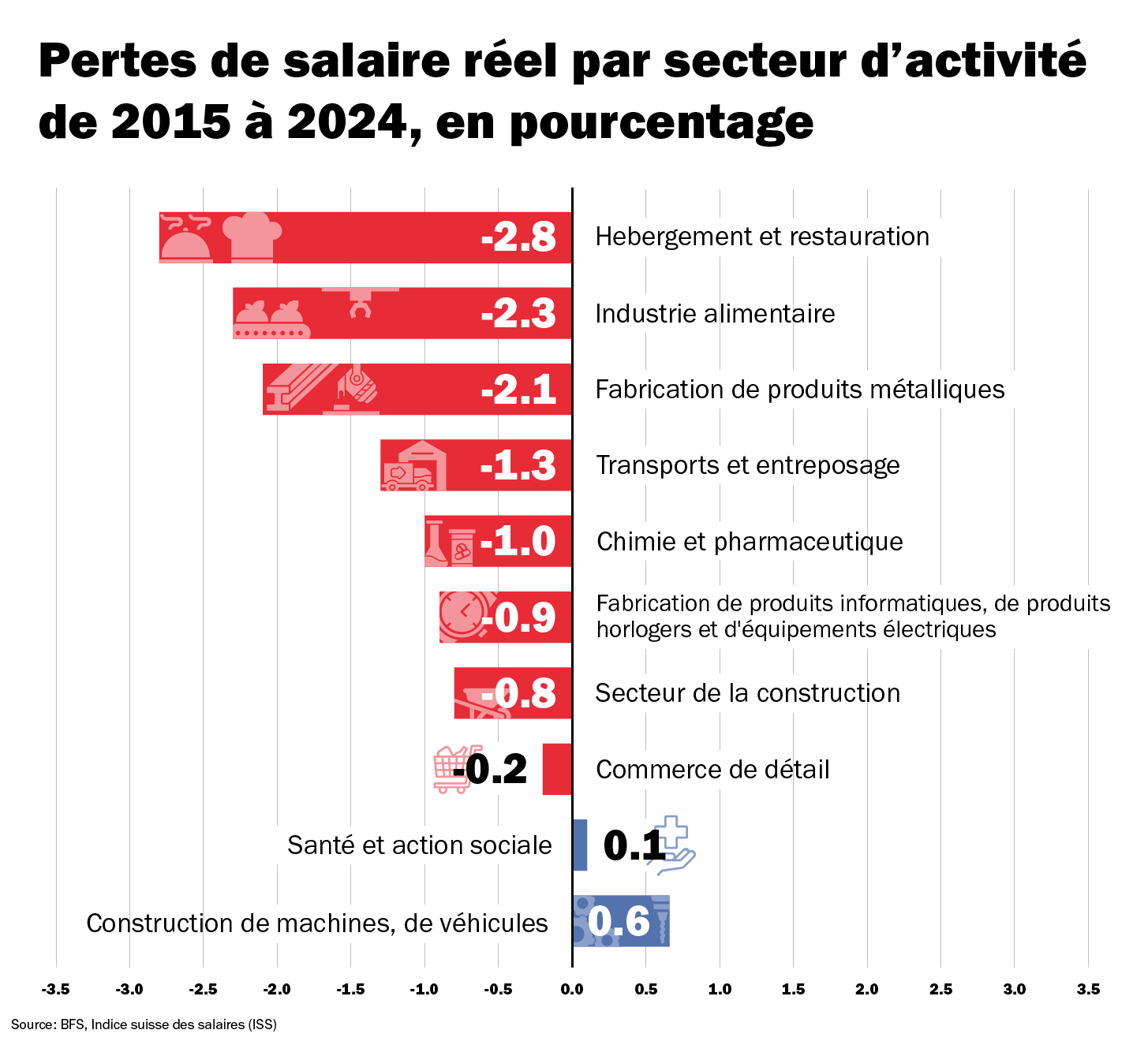 Après la crise du covid, les prix à la consommation ont fortement augmenté, alors que les salaires n’ont pas été suffisamment revalorisés. Les salaires réels ont en effet baissé dans toutes les branches entre 2020 et 2024. Ils sont certes enfin légèrement repartis à la hausse en 2024, mais cela ne suffit pas à combler les pertes des années précédentes. Aujourd'hui, les salaires réels sont plus ou moins au niveau de 2015 et même en dessous dans de nombreuses branches.