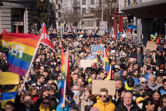 Migliaia di manifestanti a Zurigo e Ginevra hanno chiesto a gran voce la fine della guerra. Era dai tempi dello storico sciopero delle donne del 2019 che non si vedevano così tante persone nelle strade delle città svizzere.