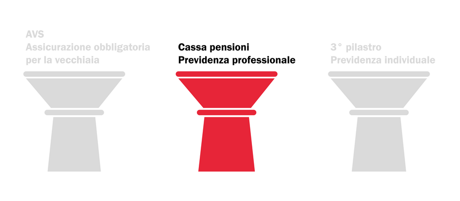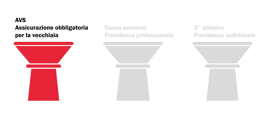 In Svizzera, la previdenza per la vecchiaia si fonda su tre pilastri. Il primo pilastro è l’assicurazione per la vecchiaia e i superstiti (AVS). Obiettivo dell’AVS è garantire il fabbisogno vitale. Il secondo pilastro è la previdenza professionale (PP / cassa pensioni). Insieme al primo pilastro ha il compito, prescritto dalla Costituzione federale, di consentire il mantenimento del tenore di vita abituale. Entrambi i pilastri sono obbligatori (il secondo pilastro a partire da un reddito di 22'680 franchi nel 2026). Il terzo pilastro, ovvero la previdenza privata, è facoltativo.
